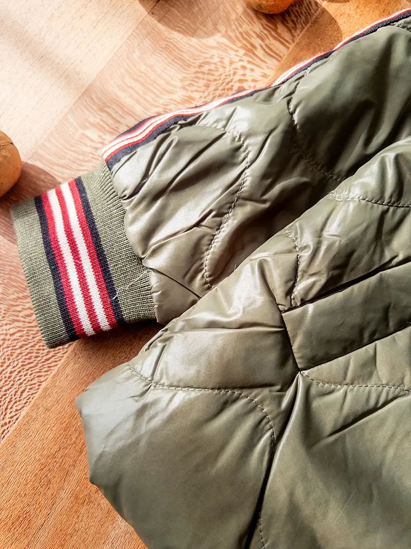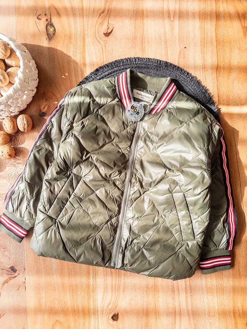 بدنه این کاپشن با دوخت لوزی و لایه داخلی نرم طراحی شده تا هم ظاهر خلبانی و امروزی داشته باشه هم بدن بچه رو گرم نگه داره، بدون اینکه روی تنش سنگین بشه. رویه پارچه حالت نیمهبراق داره و وقتی نور میخوره، رنگ سبز زیتونیش خودش رو قشنگ نشون میده و کاپشن رو تبدیل به یه لباس خاص توی کمد کوچولوت میکنه.
