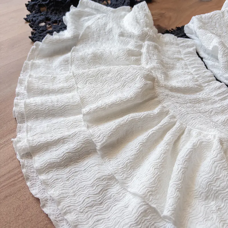 این ست جذاب شامل یه کراپ کوتاه با گل برجسته روی سینه و یه دامن چین‌دار لایه‌ایه که استایل بچه‌ها رو خیلی خاص و چشم‌نواز می‌کنه. رنگ سفید ساده و در عین حال شیک این ست باعث میشه برای مهمونی‌ها، جشن تولد یا حتی مناسبت‌های رسمی حسابی بدرخشه.