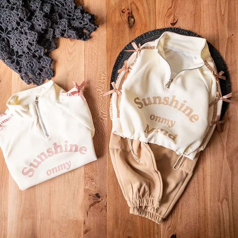 این ست نیمزیپ و شلوار دخترونه با رنگبندی جذاب کرم و صورتی، درست همون چیزیه که برای خوشتیپ کردن کوچولوتون لازمه! بلوز نیمزیپ با نوشتهی فانتزی Sunshine on my Mind حسابی به لباس حال و هوای شاد میده و روبانهای صورتی کنار لباس یه دیزاین خاص و دخترونه بهش اضافه کرده.