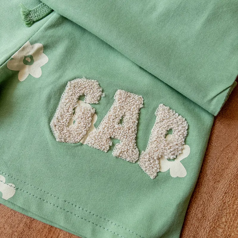 تیشرت سبز ملایم با گل‌های سفید پراکنده و لوگوی بزرگ گپ که با پارچه حوله‌ای برجسته دوخته شده، نه تنها ظاهر خاصی داره، بلکه حس لمس متفاوتی هم ایجاد می‌کنه. شلوارک ست هم با همون تم گل‌دار و لوگوی کوچک گپ، هماهنگی کامل با تیشرت داره.
