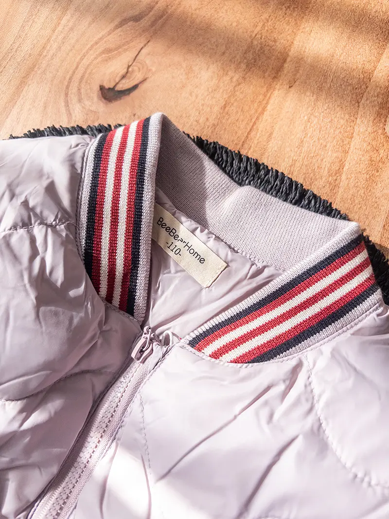 بدنه کاپشن با دوخت لوزی و لایه داخلی نرم طراحی شده تا هم ظاهر خلبانی و امروزی داشته باشه هم بدن بچه رو گرم نگه داره، بدون این‌که روی تنش سنگین بشه. رویه پارچه یه حالت نسبتاً براق داره و وقتی نور بهش می‌خوره، رنگ یاسی لطیفش خودش رو خوب نشون میده و کاپشن رو تبدیل به یکی از تکه‌های شاخص کمد کوچولوت می‌کنه.