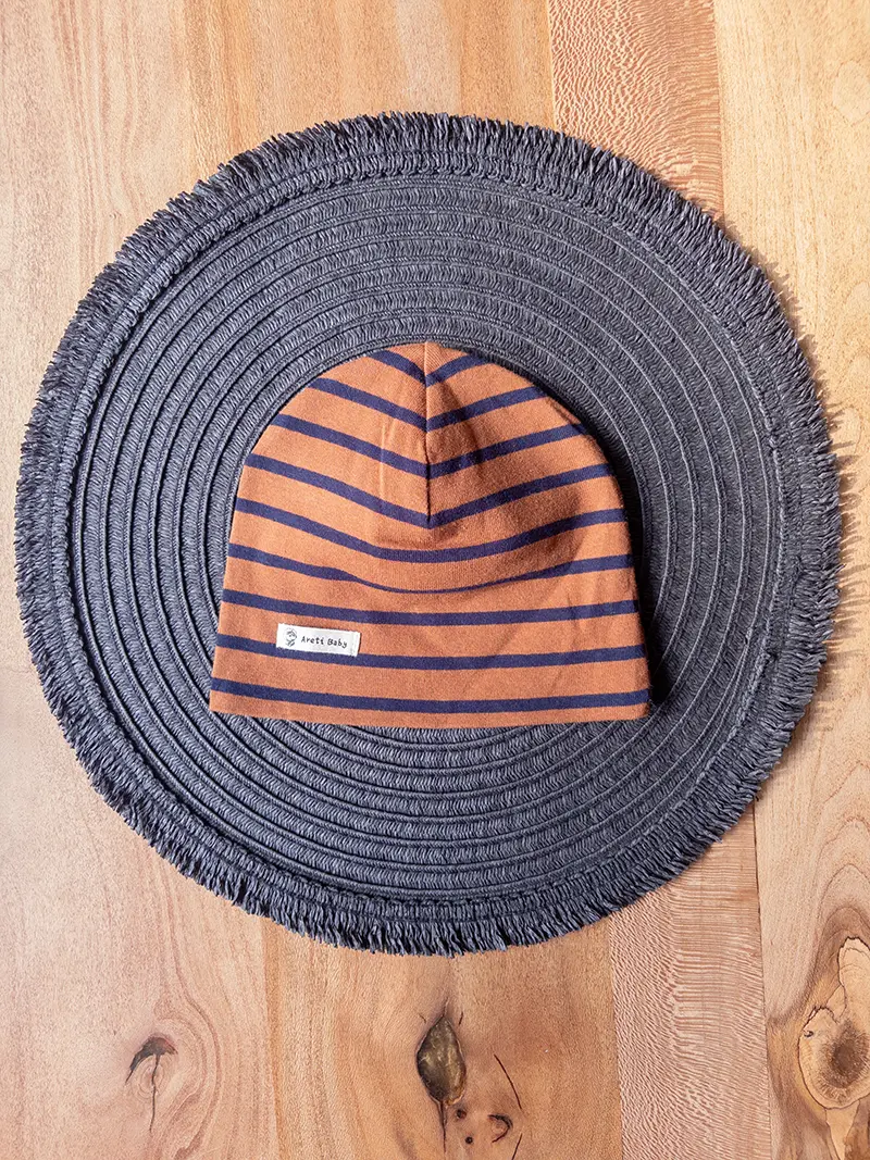 ترکیب راهراه سرمهای روی زمینه قهوهای باعث شده ظاهر کلاه هم ساده باشه هم جذاب، بدون اینکه زیادی شلوغ بهنظر برسه. جنس نخی نرمش هم کاری میکنه بچه راحت باشه و موقع استفاده طولانی احساس گرما یا اذیت نداشته باشه.