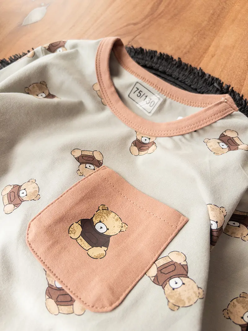 این ست راحتی یقه گرد تدی سبز با چاپ خرس‌های ریز و یه جیب کرم بامزه روی بلوز، ظاهری آروم، کودکانه و کاملاً خوش‌پوش به کوچولوت میده؛ مناسب روزای توی خونه، مهد و بازی‌های سبک.