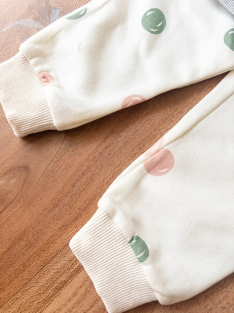 شلوار کرم‌رنگ با طرح دایره‌های سبز و صورتی، استایلی کودکانه و شاد به لباس داده. جنس پارچه‌اش نرمه، لطیفه و برای پوست حساس کودک کاملاً مناسبه. کشباف در پایین شلوار و مچ آستین‌ها باعث میشه لباس خوب روی تن قرار بگیره و موقع بازی یا حرکت، جابه‌جا نشه.