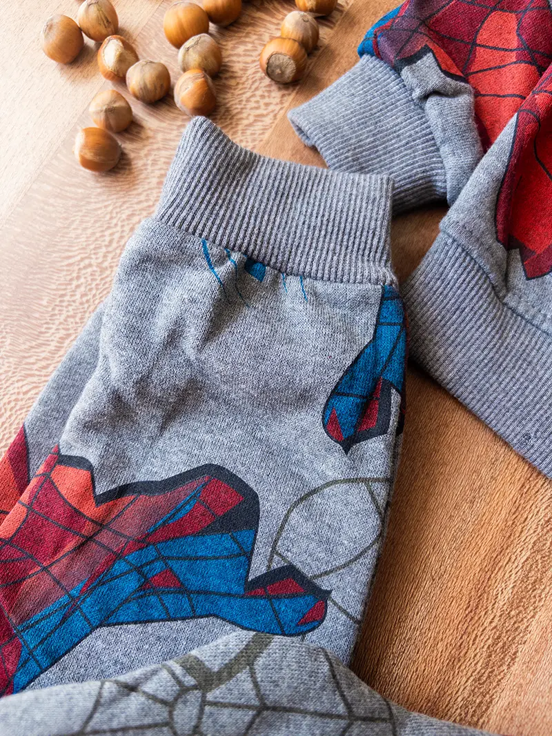 اگه دنبال لباسی هستی که هم راحت باشه هم پر از هیجان، این ست اسپایدرمن همون چیزیه که میخوای. رنگ طوسی ملایمش، بوم مناسبی برای نقش بستن ماسکها و تارهای معروف مرد عنکبوتیه که با رنگهای زنده قرمز، آبی و مشکی چاپ شدن.