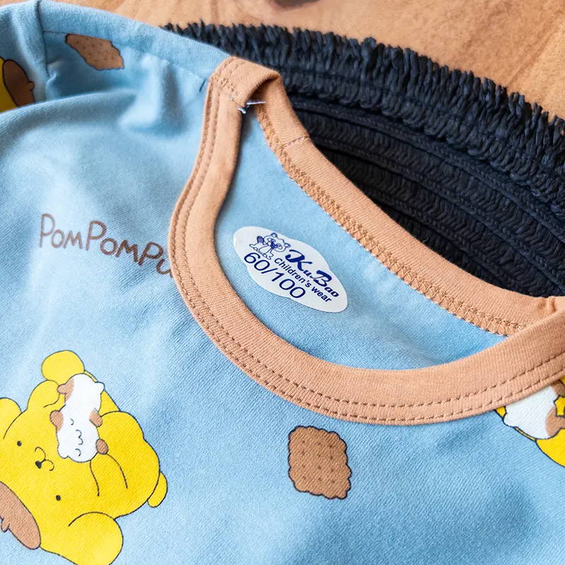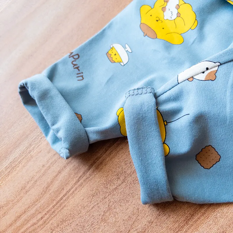 رنگ آبی زمینه لباس، حس آرامش میده و با جزئیات زرد و هلویی کاراکترها، ترکیب رنگی شادی ساخته. یقهی لباس با نوار رنگی دوردوزی شده که هم محکمترش کرده، هم ظاهرش رو خاصتر نشون میده. طرح سگ کارتونی با حالتهای مختلف و اون نوشتهی بامزه، باعث شده ظاهر لباس کاملاً برای بچهها جذاب باشه.