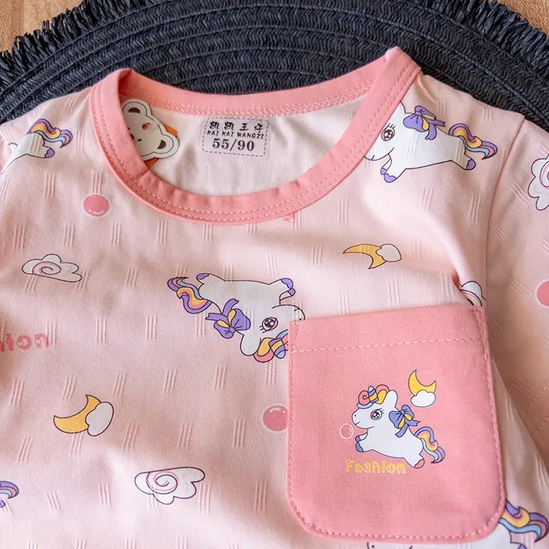 ست تابستانی صورتی با طرح بامزه اسب تکشاخ، دوختهشده از پارچه نخی خنک و لطیف. انتخابی شاد و دوستداشتنی برای روزهای گرم و پرانرژی کودک.